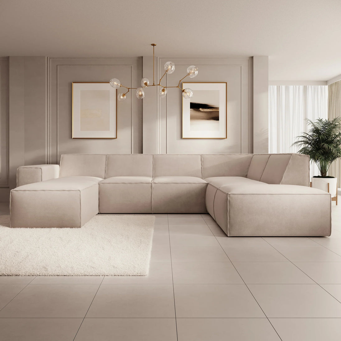 This corner sofa is a spacious lounge sofa with seating for 6 to 7 people. It features a soft beige fabric and a modern, inviting look.