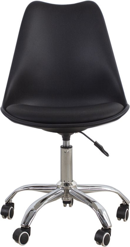 A functional and practical black office chair with an ergonomically designed seat and cushion for optimal seating comfort. The office chair has a height-adjustable seat height of 47 cm to 57 cm and stands stable on a sturdy frame with five casters. Whether on hard or soft surfaces, this chair always glides smoothly over any surface. Chair dimensions: height 87 - 97 cm, seat width 48 cm, seat depth 42 cm, and seat height: 47 - 57 cm. Backrest height 41 cm. Maximum load capacity: 100 kg. Delivery includes assembly instructions and necessary mounting materials.