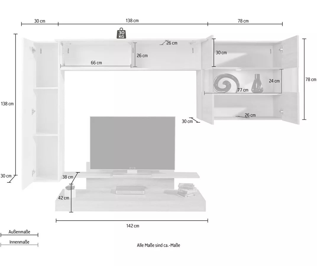Wall unit consisting of: 1 wall-mounted display cabinet, 1 cabinet, 1 wall-mounted cabinet, matte body, matte fronts, in high-gloss white, 1 TV unit with back panel, details: FSC®-certified wood, Italian design, easy-care surfaces in various colors, ample storage space, modern trend colors, metal hinges in a sublime finish, wall-mounted display cabinet can also be mounted on the left or right, cabinet: 1 wooden door, interchangeable door opening, 2 wooden shelves, 3 compartments, metal handles, dimensions (WxDxH): 30x30x138 cm, wall-mounted display cabinet: 1 right-hand opening, 1 left-hand opening, 2 wooden shelves, 3 compartments, handleless, internal compartment dimensions (WxDxH): 77x26x24 cm, dimensions (WxDxH): 78x30x78 cm, wall-mounted cabinet:
