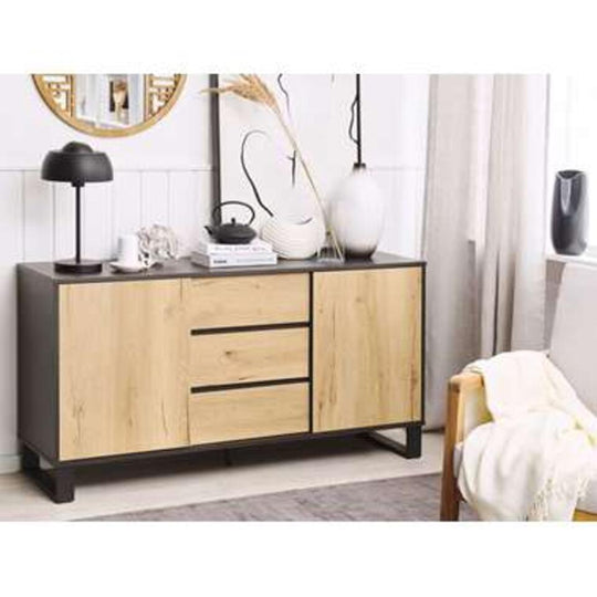 Spacious sideboard with two cabinets and three drawers. Give your living room or bedroom an industrial touch with this practical sideboard. Made of durable MDF with a beautiful wood-look finish, the sideboard stands on durable gray...Reguliere prijs €350,00Reguliere prijs €350,00 -