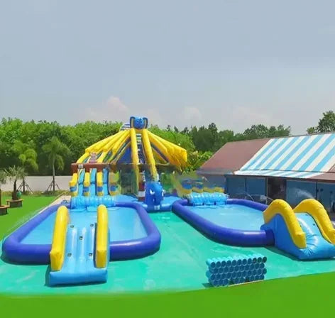 PVC compleet waterpark zwembad met glijbaan en zwembad-uitrustig blauw geel hoogte 8 meter breedte 20 meter lengte 30 meter