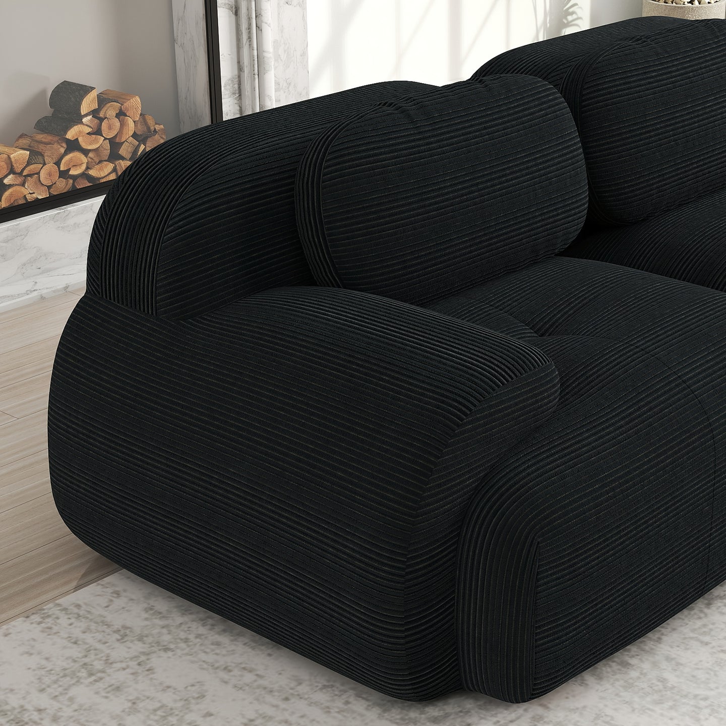 The sleek black upholstery adds a contemporary touch, effortlessly complementing any interior décor. Built with durable materials and plush cushioning, the sofa combines functionality, comfort, and style, making it perfect for lounging, movie nights, or entertaining.