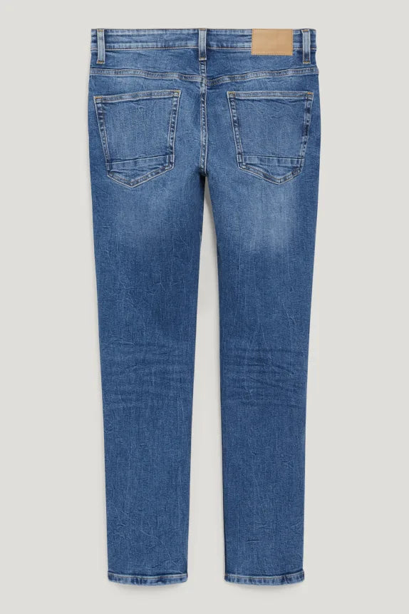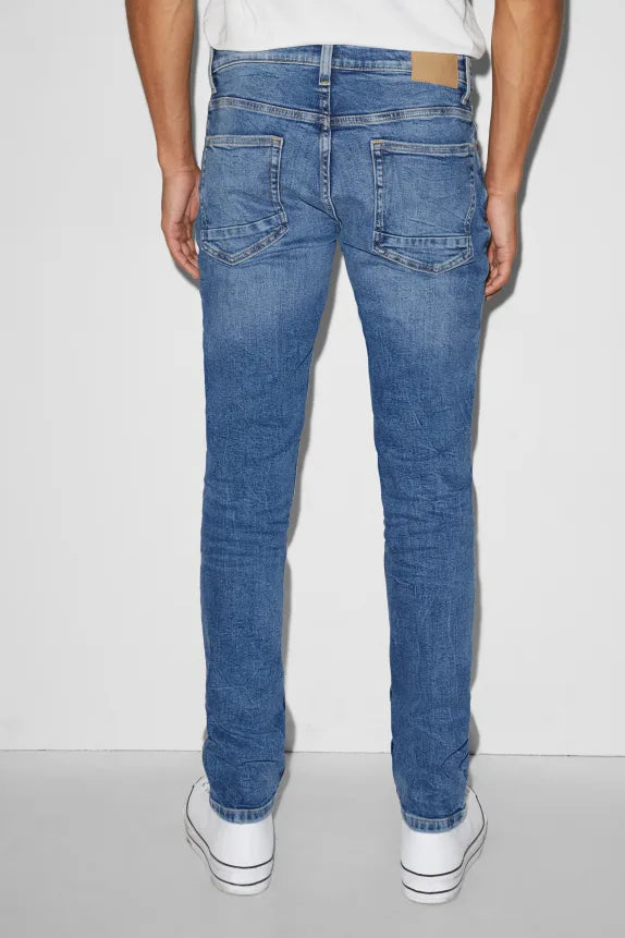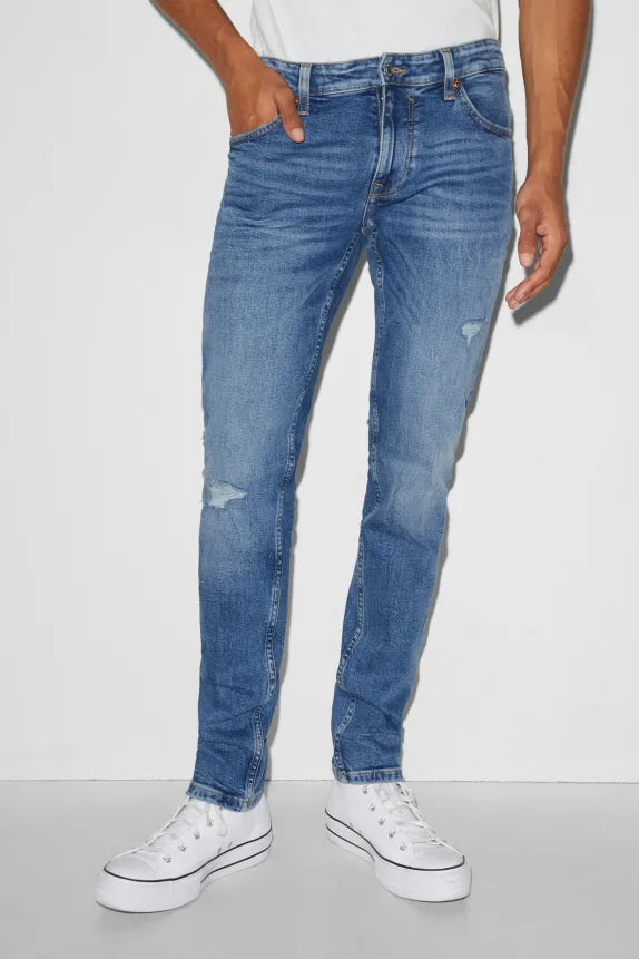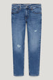Skinny jeans by CLOCKHOUSE, made of stretch denim with fake pleats, washed and distressed effects.