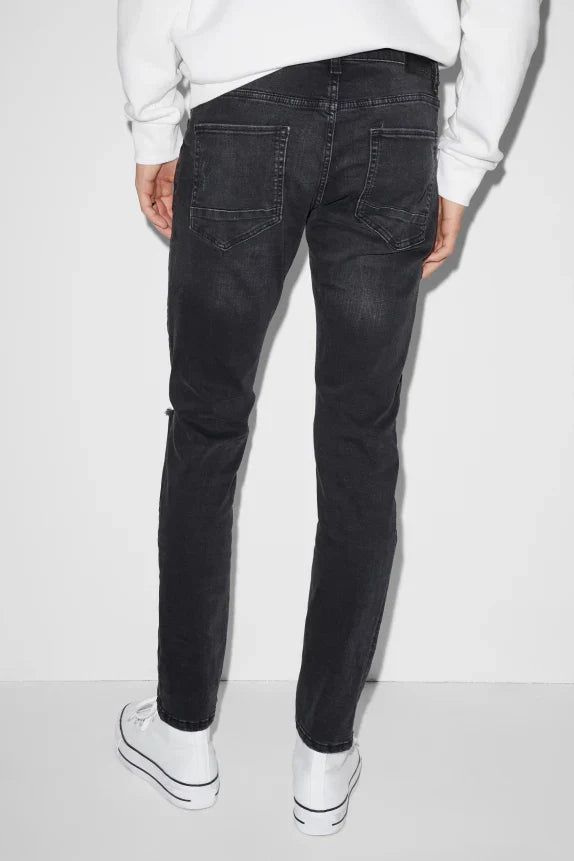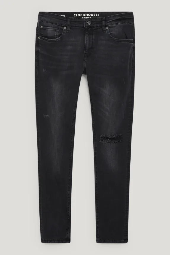 Skinny jeans made of stretch denim with washed and distressed effects.
