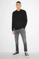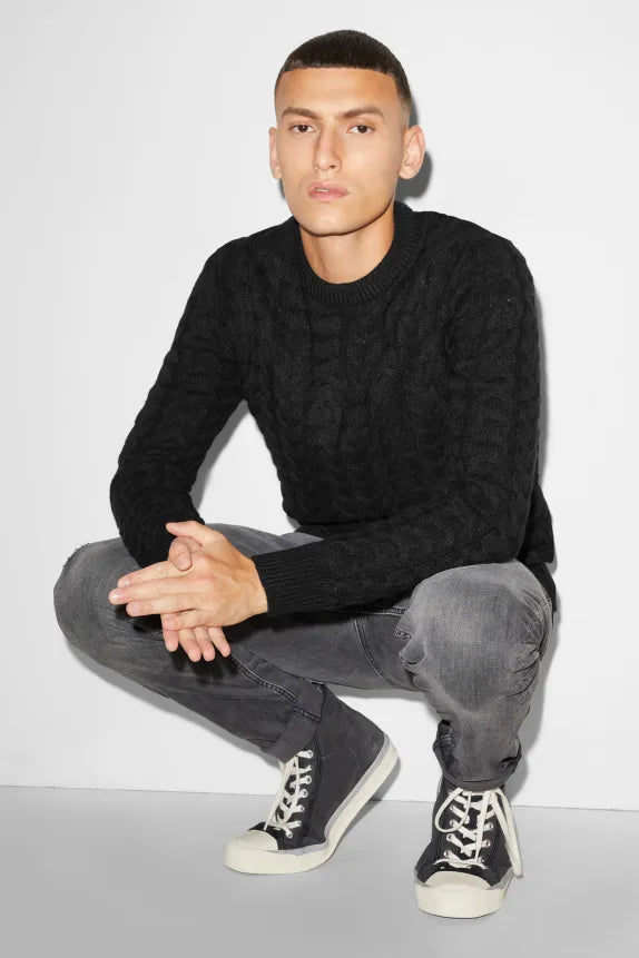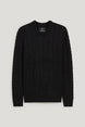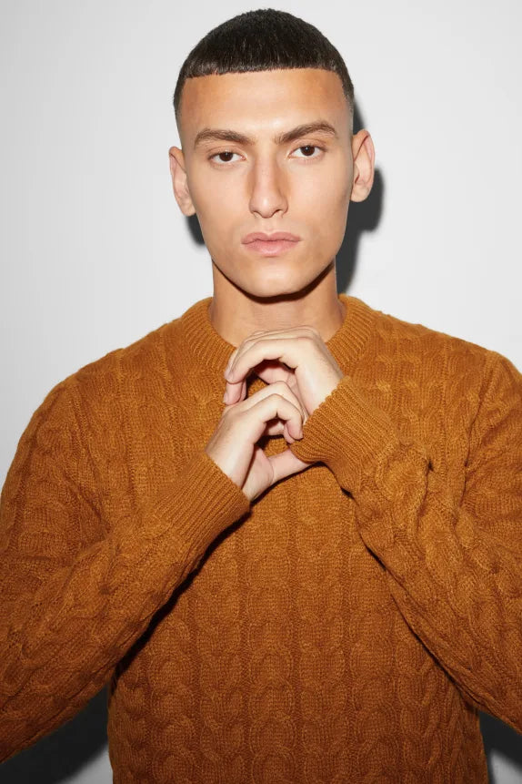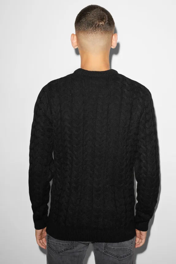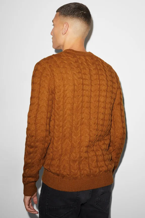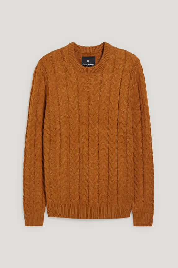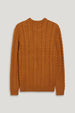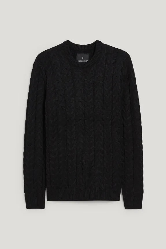Soft knitted sweater with a cable knit pattern and ribbed cuffs and hem.