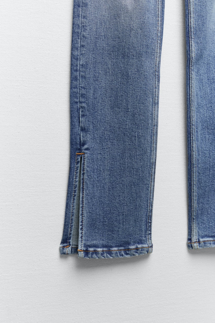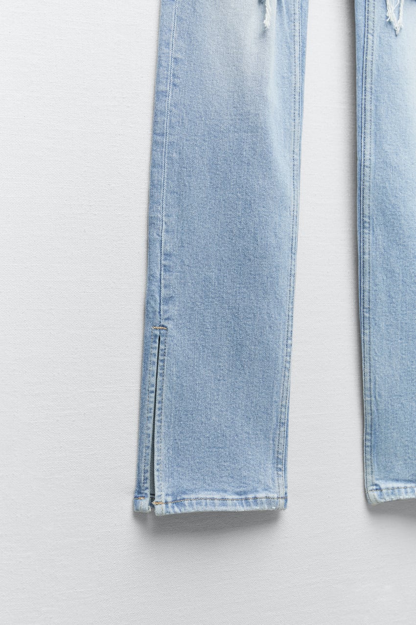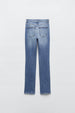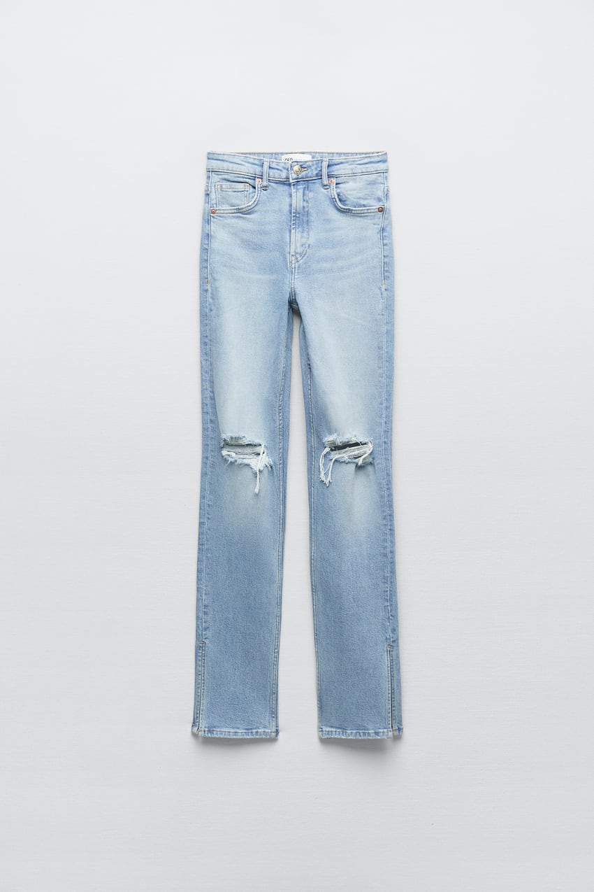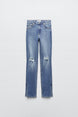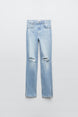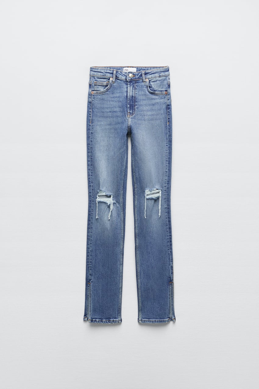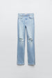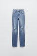 Jeans met hoge taille. Zijsplitje onderin. Scheuren. Ritssluiting en metalen knoop voor.