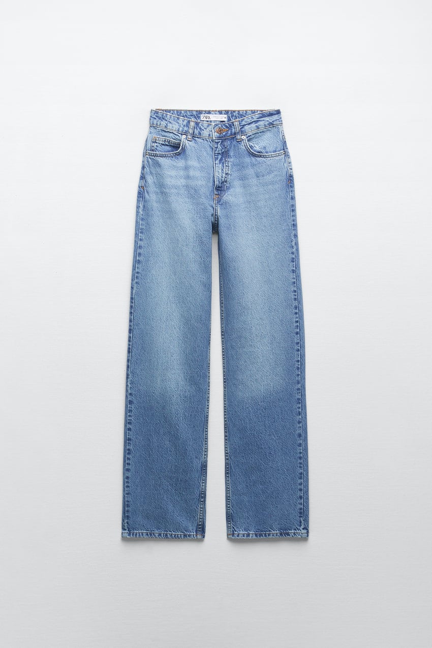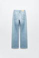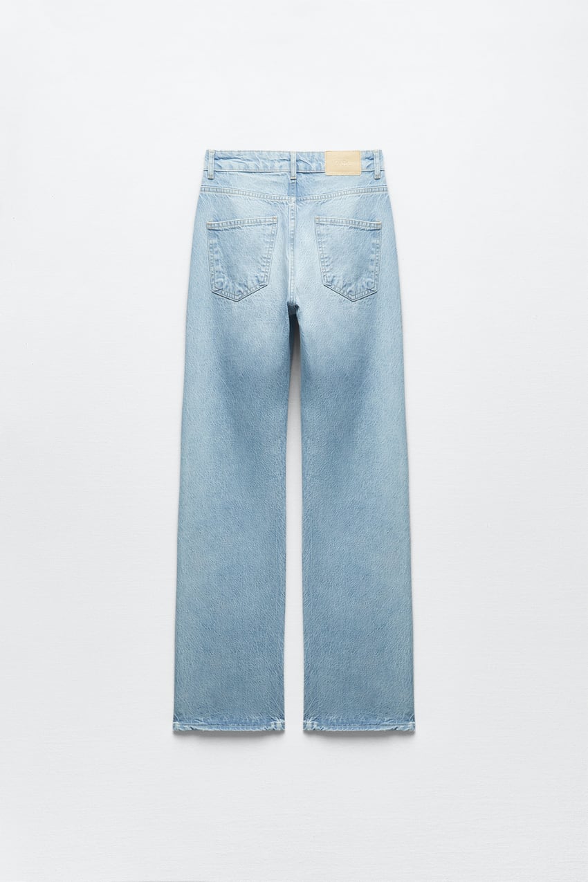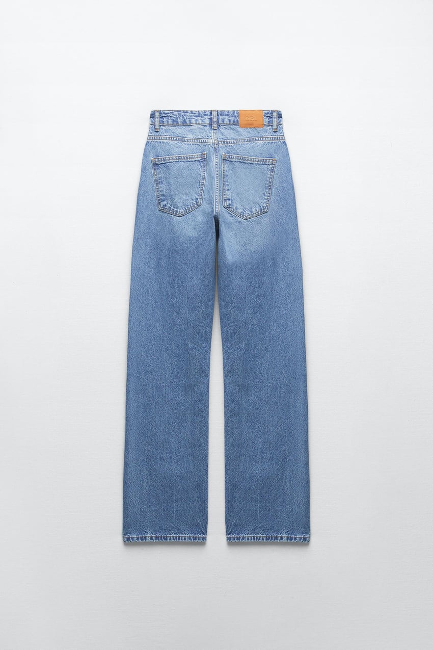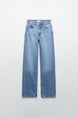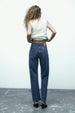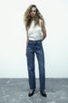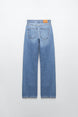 Jeans met hoge taille. Rechte lange pijpen. Ritssluiting en metalen knoop voor.