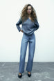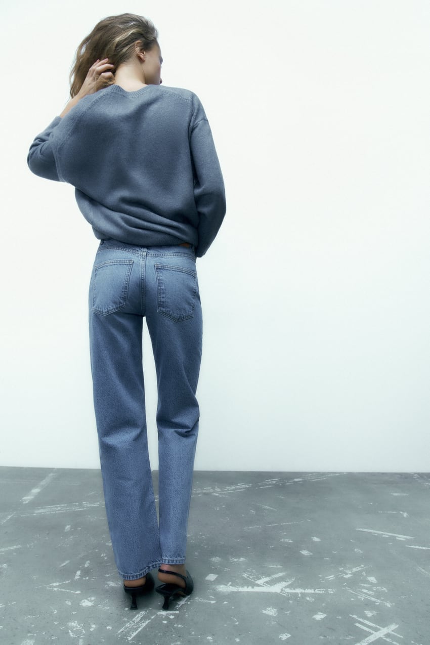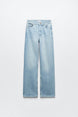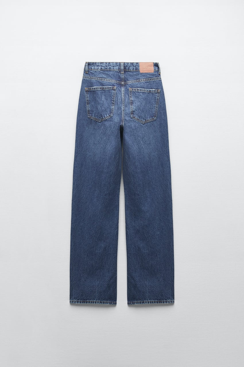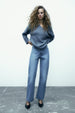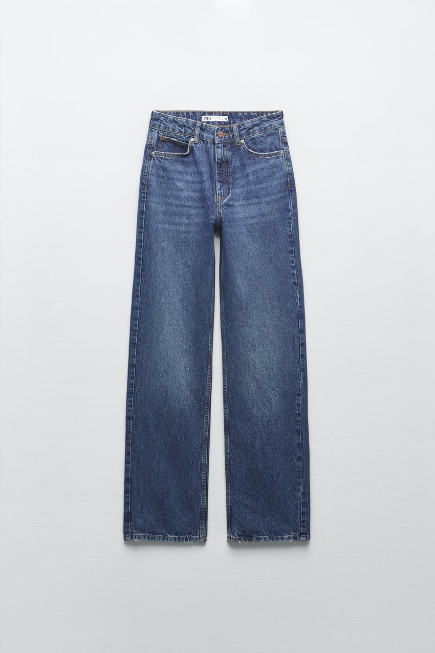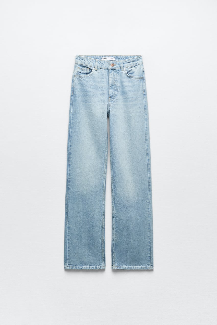 Jeans met hoge taille. Rechte lange pijpen. Ritssluiting en metalen knoop voor.