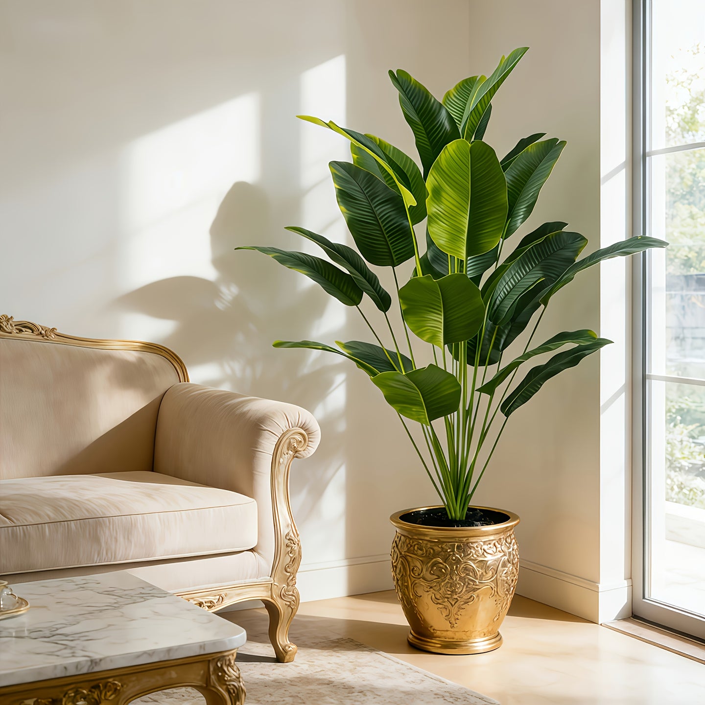 Bring a fresh, tropical touch to your interior with the UNICORN Large Artificial Banana Tree Plant. Designed to replicate the natural look of real banana leaves, this decorative plant adds vibrant greenery and a sense of elegance to modern living spaces—without the need for maintenance.